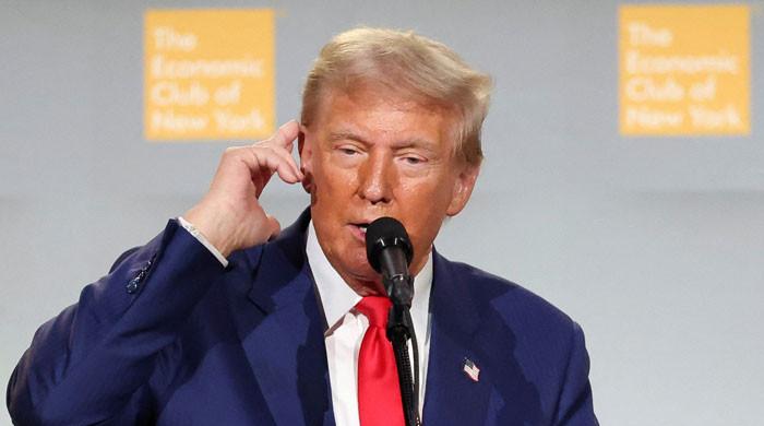 Republican presidential nominee and former US President Donald Trump points to his ear as he speaks at the Economic Club of New York in New York City, US September 5, 2024. — Reuters