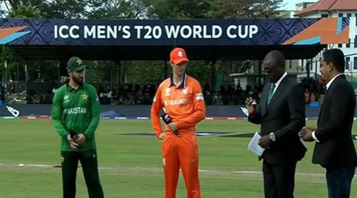 Pakistan captain Salman Ali Agha and his Netherlands counterpart Scott Edwards present for toss of the inaugural match of the ICC Men’s T20 World Cup 2026 at the Sinhalese Sports Club Ground in Colombo on February 7, 2026. — Screengrab via Geo News
